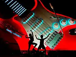 A large, red Fender Stratocaster on display outside the attraction in Florida