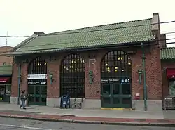 As the entrance is at street level, the station is ADA accessible without the use of an elevator or ramps.[19] The station house, located on the east side of Beach 116th Street between Rockaway Beach Boulevard and Beach Channel Drive, is made of concrete with windows and plywood walls and a brick exterior. It also has an entrance leading to an adjacent restaurant.[20] An examination of the station house shows the former ticket windows, which were used when the line was part of the LIRR. The station houses Transit Police District 23,[20] which was moved to the station in June 1977.[21] A new police facility was opened on September 18, 2009.[22][23][24][25] A NYCDOT municipal parking lot lies just north of the station.[20][26]