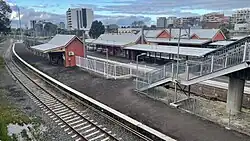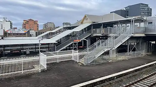 In 1920 a steel footbridge from the Maitland District was re-erected, followed in 1922 by the timber overhead booking office. In 1923 quadruplication of the line was undertaken, and new platforms added for the quadruplication. The original signal box was built on the north end of Platform 2-3 but in 1923 was replaced by the present (disused) brick elevated box on the western side of the line, east of the T junction of Railway Street and Oakura Street. Also in 1923 a new Platform No. 1 with brick waiting shed was built along with another siding, both having "dead-end" sidings for carriage storage. In 1926 the lines were electrified, and the tramway link was disconnected in 1938.[3]