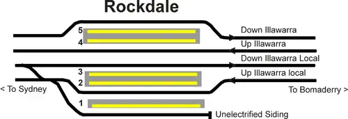 Rockdale Railway Station is located between Railway Street on the west and Geeves Avenue on the east and is accessed from both streets via a footbridge, stairs and modern lifts. The station has three island platforms. Along both Railway Street and Geeves Avenue adjacent to the station are extensive bus shelters. Adjacent and to the south of the western entry to the station (off Railway Street) is a distinctive 2-storey brick Inter-War Functionalist style retail building.[3]