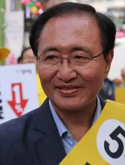He served as a member of the National Assembly from 2004 to 2008.[6] He co-founded the New Progressive Party with Sim Sang-jung, Cho Seungsoo, and other members of the People's Democracy faction of the Democratic Labor Party.[7] He unsuccessfully ran for Mayor of Seoul as a New Progressive Party candidate in 2010.[8] He again served as a member of the National Assembly on behalf of the Unified Progressive Party and the Justice Party in 2012 to 2013.[9] Roh broke with the Unified Progressive Party after allegations that the faction led by the party leader Lee Jung-hee had manipulated the party list to elect members of her own faction into the National Assembly.[10] He, with Sim Sang-jeong and Rhyu Si-min, formed the Progressive Justice Party in October 2012, but in 2013 it became the Justice Party.[11][2]