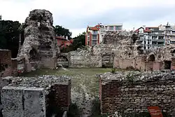 Ancient Varna, first a Thracian settlement and then an Ancient Greek colony, became part of the Roman Empire in 15 AD and was assigned to the province of Moesia with a certain degree of local autonomy. The Roman baths of Varna were built towards the end of the 2nd century and remained in use for about a hundred years, till the late 3rd century.[1] Coins of Roman emperor Septimius Severus (r. 193–211) have been discovered among the bath ruins.[2] Much later, in the 14th century, the ruins of the Roman Thermae were the site of craftsmen's workshops.[3]