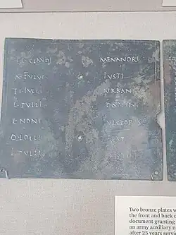 A Roman military diploma was a document inscribed in bronze certifying that the holder was honourably discharged from the Roman armed forces and/or had received the grant of Roman citizenship from the emperor as reward for service.[1]