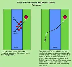 In the vertebrate spinal cord, Robo1 and Robo2 are expressed on commissural axons and act as repulsive receptors for the Slit ligands expressed by floor plate cells located at the midline.[11] In contrast, Robo3/Rig1 is required for midline crossing, and acts in part by antagonizing Slit-mediated repulsion by Robo1 and Robo2.[23]