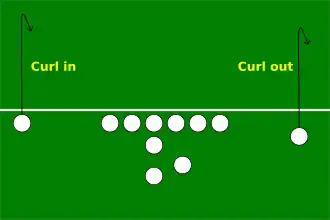 A curl route, also called a hitch or hook (sometimes a button hook), is a route where the receiver appears to be running a fly pattern but after a set number of steps or yards will quickly stop and turn around, looking for a pass.[3] This generally works best when the defending corner or safety commits himself to guarding the fly and is unable to stop quickly enough to defend the pass. A "curl out" on the sideline is often referred to as a comeback route.[4]