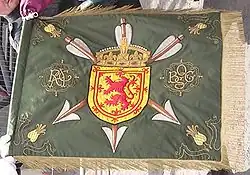 The Royal Company has two standards. The first of these bears on one side Mars and Cupid encircled in a wreath of thistles, with this motto: In peace and war. On the other, a yew tree, with two men dressed and equipped as archers, encircled as the former motto: Dat gloria vires (Glory Gives Strength). The other standard displays on one side, on a field or, a lion rampant gules, encircled with a double tressure flory-counter flory of the second (the Royal Arms of Scotland); on the top, a thistle and crown, motto: Nemo me impune lacessit (no one provokes me with impunity). On the other, St Andrew on the cross on field argent; at the top, a crown, motto: Dulce pro patria periculum (danger is sweet for one's country).[25]