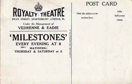 Again, the theatre was threatened with closure by the authorities, but Santley had it rebuilt again in 1906 to meet safety requirements.[4] After redecoration in French Regency style, which increased the capacity of the theatre to 657 seats,[1] the Royalty reopened on 4 January 1906 with a season of Theatre Français directed by Gaston Mayer.[3] Sarah Bernhardt led her own company in La Tosca, Phedre and La Dame aux Camelias in 1907.[4] In 1911, J. E. Vedrenne and Dennis Eadie acquired the theatre, and in 1912, they staged Milestones, by Arnold Bennett and Edward Knoblauch (later Knoblock), which had over 600 performances.[3] Owen Nares, Gladys Cooper and Lynn Fontanne appeared at the theatre early in their careers.[4] The Man Who Stayed at Home was a hit at the Royalty in 1914, playing for 584 performances.[1] Henry Daniell starred as Bobby Gilmour in The Man from Toronto at the theatre in May 1918.