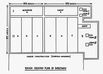 According to Kárný, the report describes the camp "with absolute accuracy", including its construction, installations, security, the prisoner number system, the categories of prisoner, the diet and accommodation, as well as the gassings, shootings and injections. It provides details known only to prisoners, including that discharge forms were filled out for prisoners who were gassed, indicating that death rates in the camp were falsified. Although presented by two men, it was clearly the product of many prisoners, including the Sonderkommando working in the gas chambers.[123] It contains sketches of the gas chambers and states that there were four crematoria, each of which contained a gas chamber and furnace room.[124] The report estimated the total capacity of the gas chambers to be 6,000 daily.[125]