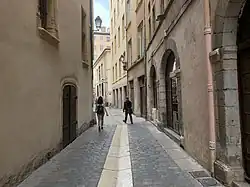 The Rue de Gadagne (French pronunciation: [ʁy d(ə) ɡadaɲ]) is a paved pedestrian street in the Saint-Jean quarter, in the 5th arrondissement of Lyon, France. It extends the Rue du Bœuf and ends on the Rue Lainerie that leads itself to Place Saint-Paul. It is located in the center of Vieux Lyon and is part to the area which includes a mosaic of squares: the Place du Change, Place du Petit Collège and Place de la Baleine in the extension of the Rue Saint-Jean. The street belongs to the zone classified as a World Heritage Site by UNESCO.