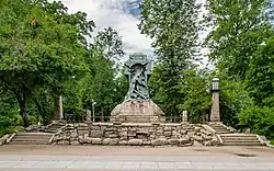On 23 May [O.S. 10 May] 1911,[6] a monument dedicated to Steregushchiy′s loss in action was opened in Alexander Park on Kamennoostrovsky Prospekt in St. Petersburg in the presence of Emperor Nicholas II. The sculptor Konstantin Vasilievich Isenberg[7] and the architect Aleksandr Ivanovich von Gauguin designed the monument, Professor V. N. Sokolovsky made the calculations for its foundation, and V. Z. Gavrilov cast the sculpture.[8] The monument depicts two sailors – V. Novikov and I. Bukharev – opening Steregushchiy′s Kingston valves to scuttle her and prevent her capture by the Japanese. In May 1911, the Russian magazine Iskra published photographs of the monument's opening ceremony, with a caption under one of them reading "The monument to the heroes of the destroyer 'Steregushchiy' opened on May 10 in St. Petersburg in the Highest Presence with a stream of water pouring from an open porthole."[9]