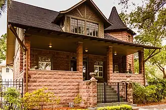 Rusticated concrete block is the handmade product of in-field advances in cement making.[1] These concrete blocks first appeared in the late 19th century and are used mainly in residences and small building construction and are meant to resemble rusticated stone blocks. Rusticated concrete block involves a rough surface with a carved bevel detail around the edge of the face of the block.[2] The rough texture of the face is created by running the concrete across a cast-iron face plate or by using a plaster mold taken from a cut stone block.[3] This process of texturing concrete block was streamlined by an inventor named Harmon S. Palmer, who created a machine that combined the processes of texturing and forming the concrete blocks. Palmer's integration of the rusticated concrete block forming processes allowed for the material to gain national notoriety and led to its eventual inclusion in the Sears kit homes.[1]