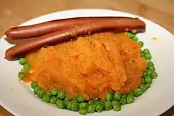 In Sweden and Norway, rutabaga is cooked with potato and sometimes carrot, and mashed with butter and either stock or, occasionally, milk or cream, to create a puree called rotmos (Swedish, literally 'root mash') or kålrabistappe (Norwegian). Onion is occasionally added. In Norway, kålrabistappe is an obligatory accompaniment to many festive dishes, including smalahove, pinnekjøtt, raspeball and salted herring. In Sweden, rotmos is often eaten together with cured and boiled ham hock, accompanied by mustard. This classic Swedish dish is called fläsklägg med rotmos.