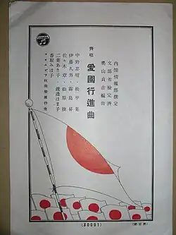 In 1936, NHK started radio program "Kokumin Kayō" (国民歌謡, lit. "National Kayō") to compete with ryūkōka, which was under the influence of "Ero Guro Nansensu", but it soon began to air war songs around July 1937.[18] The program was renamed to "Warera no Uta" (われらのうた, lit. "Our Songs") in 1941 and then "Kokumin Gasshō" (国民合唱, lit. "National Group Singing") in 1942.[18] The songs during the war were called "Senji Kayō" (戦時歌謡). During the war, many musicians were forced to write war songs. Yuji Koseki composed many war songs and was later criticised as a war collaborator, though he seemed to be touched with remorse.[25] Koseki composed "Roei no Uta" (露営の歌, lit. "Song of the Camp") released in 1937. Although the song was a B-side song, it sold 600,000 copies.[26] The 1937 song "Aikoku Kōshinkyoku" (愛国行進曲, lit. "Patriotic March") sold 1,000,000 copies.[27] However, Japanese jazz musicians such as Ryoichi Hattori seemed to be vigorless to compose war songs.[28] His son Katsuhisa Hattori claimed that he was not an antinationalist and he technically were hardly not able to compose war songs even if they wanted to make those because Japanese war songs were musically enka.[28]