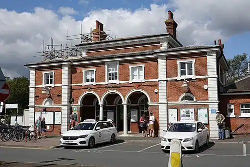 Construction of the station building began in 1847. It was designed by William Tress in symmetric Italianate style of two storeys with an attic in red brick with a slate roof and set of gateless gate pillars.[1][20] As Rye was planned to be a more significant stop than Appledore or Winchelsea, it was designed to be bigger than those. Tress also designed a goods shed in a similar style, sited alongside the main station building.[3]