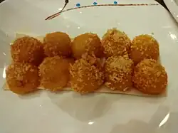 (pronounced [si˥˧], Min Dong Chinese: 𥻵, transcribed as sì in Foochow Romanized) is a traditional spherical dessert made from glutinous rice, eaten in celebration of the Winter Solstice festival in Fuzhou, Fujian Province, China. It is usually produced without filling, in contrast to the tangyuan. The sì is made by grinding glutinous rice into a powder, pressing the powder until almost dry, and then rolling the dry powder into a spherical shape, and finally adding fried (even burnt) soybean powder mixed with brown sugar onto the glutinous rice sphere.
