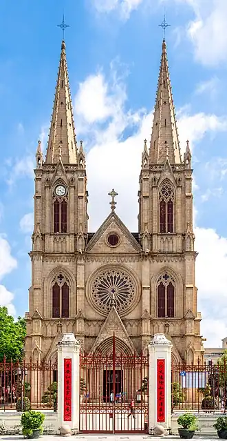 The Sacred Heart Cathedral, properly the Cathedral of the Sacred Heart of Jesus and also known as the Stone Chamber or Stone House by locals,[2] is a Gothic Revival Roman Catholic cathedral in Guangzhou, China. It is the seat of the Archbishop of Guangzhou. The cathedral is located at 56 Yide Road (一德路56号), on the north bank of the Pearl River at the heart of the old district. It is one of the few cathedrals in the world to be entirely built of granite, including all the walls, pillars, and the twin towers.