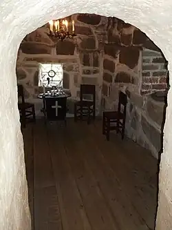 Sacristy with a sacristy credens (a cabinet with wide and very shallow drawers in which vestments and hangings are stored). A chasuble and stole are laid out on top of it, ready to be put on.