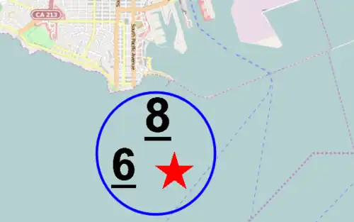 OpenStreetMap view of the current map of Los Angeles. Projected are the 1932 Olympic courses of the 8 Metre (Blue Area).