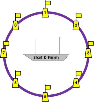 The sailing was done on the triangular type Olympic courses. The start was made in the center of a set of 8 numbered marks that were places in a circle. This made it possible to begin and finish every race sailing against the wind, regardless of the direction of the wind. During the starting procedure the sequence of the marks was communicated to the sailors. Starting upwind ensure a fair start of every race.[3] This mark system is, at least in certain German lakes, still in use in many places.