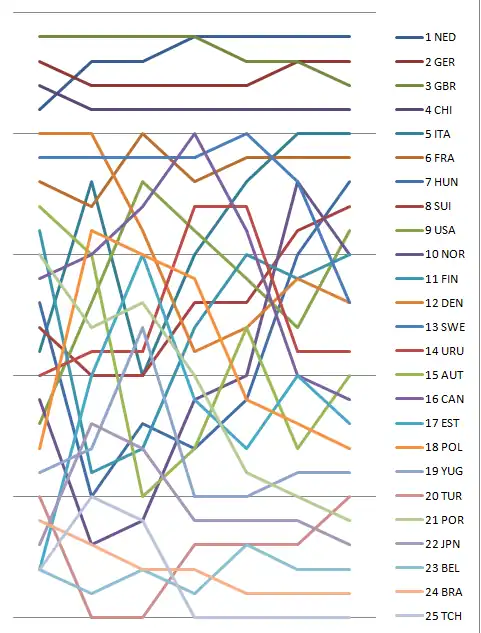 Graph showing the daily standings in the O-Jolle during the 1936 Summer Olympics