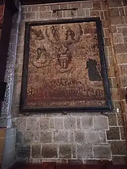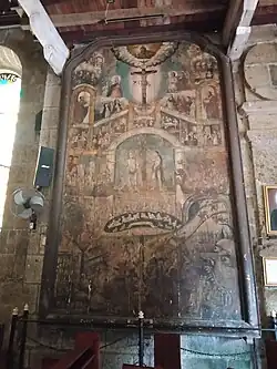 The large wall paintings on wood panels inside the church were executed by another notable son of Paete, Luciano Dans. These depict Langit, Lupa, Impiyerno – Heaven, Earth, Hell – and large murals of Saint Christopher. Dans used natural color pigments mixed with volcanic ash and brushes made from cats' hair to create the murals.[10] The large painting of San Cristobal on wood was purchased during the time of Father Francisco de Santa Gonzaleza for ₱22 in October 1852.[6] Unfortunately, the two St. Christopher paintings currently need immediate conservation; a lot of wood panels inside the church, including the painted wood panels, are infested by termites.[11][12]