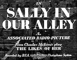 Sally in Our Alley is a 1931 British romantic comedy drama film directed by Maurice Elvey and starring Gracie Fields, Ian Hunter, and Florence Desmond.[1] It was written by Miles Malleson, Archie Pitt and Alma Reville based on the 1923 West End play The Likes of Her by Charles McEvoy.