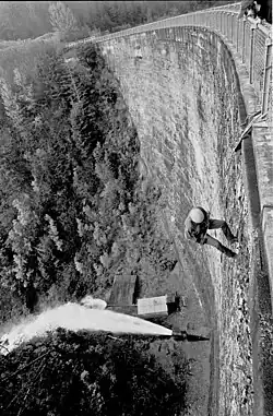 Left: Salmon Creek Dam in 2006 after rehabilitation; top of the dam 6.5 ft (2.0 m) walkway. Right: Salmon Creek Dam, full arch downstream view.