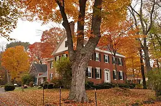 The district is centered along a stretch of Route 117 extending south from a bend in the Saco River to the road's junction with Simpson and Elden Roads. Eleven properties line this piece of road, with another two on Simpson and Elden completing the district inventory. The oldest house, the Elden family homestead, stands on the south side of Elden Road, and is a fine Federal-style estimated to date to the 1790s. The Came-Marshall House, located just northwest of the junction, is probably the most impressive house in the district: it is a 2-1/2 story Federal-style brick structure, with an elaborate entry that has sidelight windows and a semi-circular fanlight. Most of the houses in the district, however, were built between 1825 and 1850, and are Greek Revival in character. Most are wood-frame structures 1-1/2 or 2-1/2 stories in height, although three are built out of brick. The latest building in the district is the c. 1868 Darrah Tavern, which anchors the district's northern end.[2] Two buildings are non-contributing to the district. One, the Jabez Haley House, has been altered. It was built in 1862. The other house was moved to the corner of Elden Lane and Route 117 in 1936. The Hopkinson-Nichols House is a Cape Style house that was built c. 1800, but it was not a part of the neighborhood when the other houses were built.