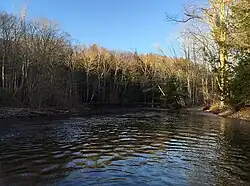 The Salmon River is formed at the confluence of the Blackledge and Jeremy rivers about one mile west of North Westchester, Connecticut. It drains 96,000 acres[1] and courses for 10.4 miles (16.7 km)[2] to Salmon Cove near Moodus where it flows into the Connecticut River. The Salmon River is probably the largest stream and watershed whose sources and mouth are entirely within the limits of Connecticut.[3]