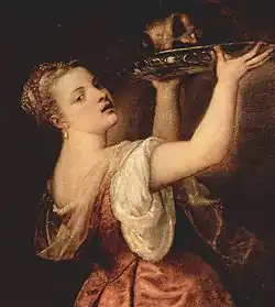Salome, in Jewish history, was the name borne by three women of the Herod dynasty. Titian depicts the daughter of Herodias by her first husband Herod Philip. She was the wife successively of Philip the Tetrarch and Aristobulus, son of Herod of Chalcis. This Salome is the only one of the three who is mentioned in the New Testament,[1] and only in connection with the execution of John the Baptist. Herod Antipas, pleased by her dancing, offered her a reward "unto the half of my kingdom"; instructed by Herodias, she asked for John the Baptist's "head in a charger".[2]