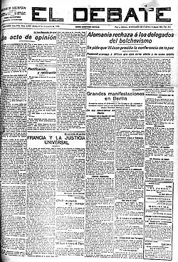 A numerically dominant group of Minguijón's writings are his press contributions, usually some 800-word commentaries dealing with ongoing public affairs. Far from partisan zeal and styled as impartial essays, within a wide public discourse they gained Minguijón recognition as a pundit. Starting in the early 1910s, he began to contribute to Catholic dailies across the country.[58] However, he was particularly active writing to El Debate and emerged as a key commentator of the Madrid daily. As during the Republic years El Debate became a semi-official CEDA mouthpiece; Minguijón, at that time member of the supreme national court, preferred to publish rather in various regional Catholic periodicals.[59] During the Civil War and afterwards he did not resume his career as a press pundit.
