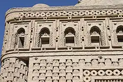 Overall, the building is constructed in a form of a small, slightly tapering cube, with each side approximately 31 feet (9.4 m) long.[5] There are four identically designed facades which gently slope inwards with increasing height. Wall thickness of approximately 6 feet (1.8 m)[9] at the base of the building assured structural solidity and survival through the ages. Each side has an entrance portal adorned with pointed arches. Many researches note well-studied,[5] almost mathematical,[9] proportions of the building and its harmonious[6] hierarchy.[5] The base of the building is heavy which is accentuated by a wider foundation; four heavy built in three-quarter[23] corner columns, classical in design,[7] contribute to its fortress-like appearance. The top of the building is lightened up through an elegant arcade gallery, placed below the cornice, that have many arched openings to reduce overall weight and to let light inside the building (in contrast, most of chahar taq structures had no windows). A large semi-circular Dome, about 23 ft (7 meters[22]) in diameter crowns the structure and it is similar to the Buddhist domes in the area.[7] Four mini domes placed in the corners of the roof are more decorative in nature. Overall, the mausoleum's builders achieved an elegant hierarchy of diminishing proportions and vertical perspective through the diminishing size of the domes (one large and four small), columns (placed in the corners, portals and gallery) and arches (portals and gallery). Typical for Islamic architecture in general, there is an overlap and ambiguity between the structural and decorative features within the building – bricks being structure and décor, both equally important.[24]