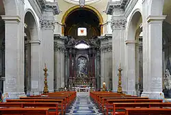 In 1634, the Baroque painter and architect Pietro da Cortona was asked by the Florentine nobleman Orazio Falconieri to design the high altar.[6] Drawings for the altar and its setting and a model were prepared but the project was not carried out. Cortona's ideas for the choir included windows hidden from the view of the congregation that would illuminate the altarpiece, an early example of the Baroque usage of a "hidden light" source, a concept which would be much employed by Bernini. Some twenty to thirty years later, Falconieri resurrected the choir project but gave the commission to the Baroque architect Francesco Borromini, who changed the design to allow for the burial of Orazio's brother, Cardinal Lelio Falconieri. After Borromini's death in 1667, the work was completed and partly modified by Cortona and, on his death in 1669, by Ciro Ferri, Cortona's pupil and associate.[7]