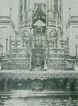 However, by the end of the 16th century, the town was still little more than a group of small houses along with a small hermitage.[3] The hermitage, built by Friar Miguel de Bolonia, was dedicated to the Immaculate Conception. This structure was the first home of a very small image of the Virgin Mary, believed to have been brought to the area from Michoacán either by Bolonia or by Friar Antonio de Segovia.[2][3] Over time, moths damaged the statue and it was packed away in a corner of the sacristy. The image remained there until 1632, when it became associated with its first miracle. After this, the image was taken to Guadalajara to be restored, and it was then returned to San Juan.[2] Pilgrimages to the miraculous image soon began, and pilgrims' valuable offerings permitted the building of newer and grander churches for the image.[2] The first chapel to the image was built in 1638; it is now the Chapel of the First Miracle.[3]