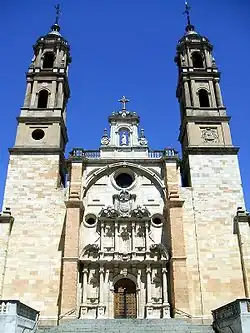 The central façade is sided by two slender bell towers dating to the 20th-century edifice.