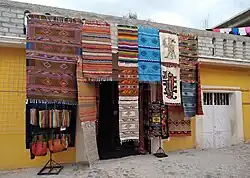 There is a small open-air Handcrafts Market just outside the archeological zone. Most of crafts made and sold here are textiles, including hand-woven and hand-embroidered traditional clothing, hammocks, sarapes, rugs, handbags, tablecloths and other items. Necklaces and bracelets are braided from fibers and decorated with beads, seeds, small stones and/or ceramic figures. Many of the designs found on the textiles here come from pre-Hispanic codices and based on Zapotec mythological figures, but more moderns images such as those from modern Mexican painters can be found as well.[4]