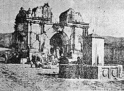 In 1902 the eruption of the Santa María volcano in the neighboring department of Quetzaltenango was responsible for the destruction of the twin towns of San Marcos and San Pedro Sacatepéquez.[9] Before 1902 the volcano had been dormant for at least 500 years and possibly several thousand years, but its awakening was clearly indicated by a seismic swarm in the region starting in January 1902, which included a major earthquake in April 1902. The eruption began on 24 October, and the largest explosions occurred over the following two days, ejecting an estimated 5.5 cubic kilometres (1.3 cu mi) of magma.[10]