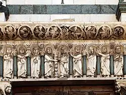 San Pier Maggiore is an originally Romanesque-style, former Roman Catholic church in Pistoia, region of Tuscany, Italy. The church is notable for polychrome decorations that partially decorate the ground floor of the exterior, similar to that see in the church San Giovanni Fuorcivitas.