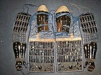 Traditional Japanese armour had six main components (hei-no-rokugu, roku gu, or roku gusoku), the dou or dō (chest armour), kabuto (helmet), mengu (facial armour), kote (armoured sleeves), sune-ate (shin armour), and the hai-date (thigh armour).[1][2][3] The sangu was composed of the suneate (shin armour), kote (armored sleeves), haidate (thigh armour). These armour components were a combination of a cloth backing and various types of armour that was attached to the cloth backing. On an original authentic suit of Japanese armour (gusoku) the cloth backings, edgings, decorations etc. and the armour elements would all be matching to each other.[4]