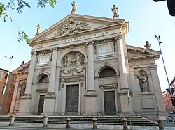 The adjacent convent was built during 1569-1573 by the Canons Regular of the Lateran, but the church building was not completed till 1608. The Lateransi had been in Piacenza since 1431, but had been evicted by the Pier Luigi Farnese from their prior holdings at the Monastery of San Marco. The neoclassical façade of the church was completed only in 1792 by Camillo Morigia.[1] The facade recalls the Roman triumphal arches, with statues and a pediment decorated with angels and garlands. At the end of the 18th-century, the monastery came to be used as a military hospital.[2] In 1798, the contents of this wealthy convent were auctioned to raise money to pay Napoleonic demands. This included a large library at the monastery.[3] In 1816, the monastery was converted into a school for young women.[4]