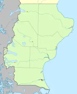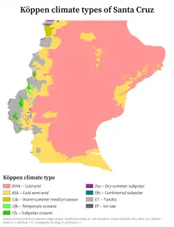 The main rivers in the province are the Deseado River (Spanish: Río Deseado), Chico River (Spanish: Río Chico), Santa Cruz River (Spanish: Río Santa Cruz), Coig River (Spanish: Río Coig), and the Gallegos River (Spanish: Río Gallegos).[15] These rivers all originate in the Andes and drain into the lakes before moving eastwards to empty into the Atlantic Ocean.[15]