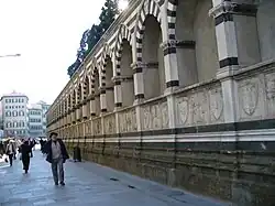 An armillary sphere (on the left) and an astronomical quadrant with gnomon (on the right) were added to the end blind arches of the lower façade by Ignazio Danti, astronomer of Cosimo I, in 1572.[5] The armilliary sphere was intended to determine the vernal equinox and this was observed for the first time publicly in 1574. The gnomon threw shadows on the astronomical quadrant to tell the time according to the transalpine, Italian and Bohemian methods.[5]