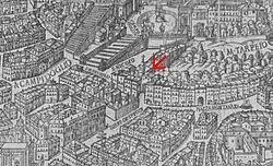 Arrow points to its location on a 1625 map near the base of the steps to the Campidoglio