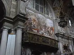 The choir lofts: these are placed on the side walls of the chancel, under the two frescoes by Giandomenico Tiepolo. The two artifacts are made of gilded and richly carved wood, with a parapet decorated with atlas lesenes framing numerous canvases, seven per chancel. In the intrados of both is engraved the date 1735, while the paintings are assignable to the seventeenth century and, in particular, to Antonio Gandino, according to the proposal put forward by Antonio Morassi[126] and also accepted by today's critics. The choir lofts and canvases, therefore, were made at two different times and in any case before the fire of 1743, which did not damage them. All the various busts of saints and bishops depicted there are characterized by impeccable pictorial execution, great spiritual concentration and heated devotion fixed in their typifying gestures and attitudes.[113] The two central panes are also characterized by the same executional attention and present as background perspective landscapes of considerable breadth, very bright, with elegant architectural inserts around them.[113][127][128]