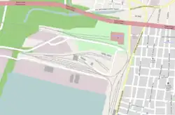 OSM map of the station and surrounding area, including the railway siding to the nearby harbor