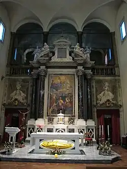 The design, with a facade with rusticated pilasters and roof-top obelisks, is attributed to Bartolommeo Ammannati or his followers. The church has an elaborate main altar with polychrome marble, and painted architecture. The main altarpiece is the Trinity with Saints John the Baptist, Paolino, Sebastian, Antony, and Catherine by Pietro Paolini. A side altar has a sculpted marble Lactating Madonna (also called Madonna della Tosse or della Latte) by Matteo Civitali. The ceiling has a frescoed oval by Trinity (1595) by Pietro Sorri. Other works lateral to the main altar were completed by Domenico Brugieri circa 1721.[2]