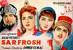 Sarfarosh is an 1956 Urdu-language Pakistani film directed by Anwar Kamal Pasha. It was a success at the box office in Pakistan.[1] The younger brother of lead actor Santosh Kumar, future director S. Suleman, worked on this film under director Anwar Kamal Pasha's guidance. Suleman was only 18 year old, but was made assistant director and received some of his initial training as a director on set.[2][3]