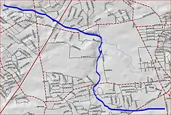The Sawmill Brook's official source is at 40°26′35″N 74°23′58″W / 40.44306°N 74.39944°W / 40.44306; -74.39944.[1] It runs through the industrialized section between Harts Lane and Route 18. It then crosses Harts Lane and runs through Tices Lane Park. Another branch from the south joins it, and it crosses Tices Lane. It crosses the New Jersey Turnpike and Ryders Lane, and drains into Westons Mill Pond, a dammed section of Lawrence Brook, at 40°27′34″N 74°25′53″W / 40.45944°N 74.43139°W / 40.45944; -74.43139.