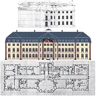 After the start of the French Revolution in 1789, Elector Clemens Wenzeslaus von Sachsen offered refuge in the palace to members of the French royal family (King Louis XVI was his nephew).[1][2] Also, he allowed Koblenz to become a centre of French monarchism.[1][2] After the emigrants left the palace, the Prussian king Frederick William II stayed there for a few days in July 1792.[1][2] Later, the palace was converted into a military hospital for Austrian soldiers.[1][2]