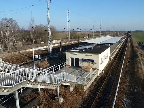 Schönfließ is a railway station in the Oberhavel district of Brandenburg. It is served by the S-Bahn line S8. It lies on the Berlin outer ring and was formerly served by regional trains.